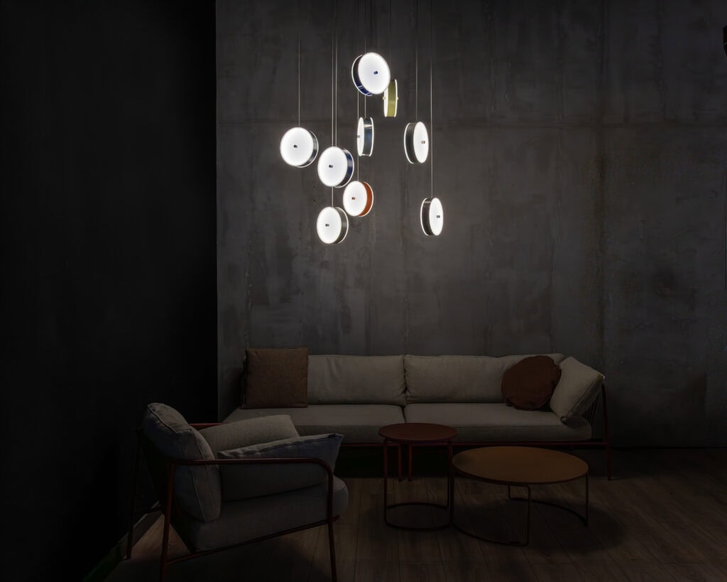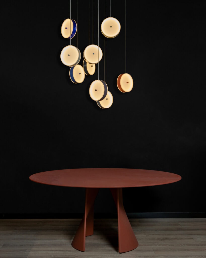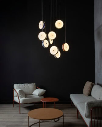 Mokosh looks striking as a single pendant but truly stands out in groups — forming sculptural lighting compositions above dining tables, in hotel lobbies or public interiors.